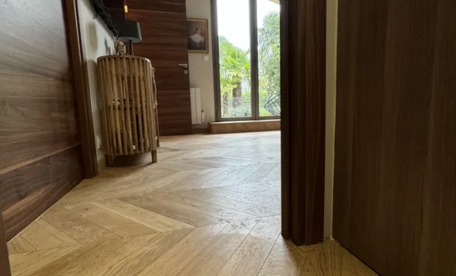 Atelier Céramique & Bois a effectué la pose d'un parquet massif en point de Hongrie à Lissieu