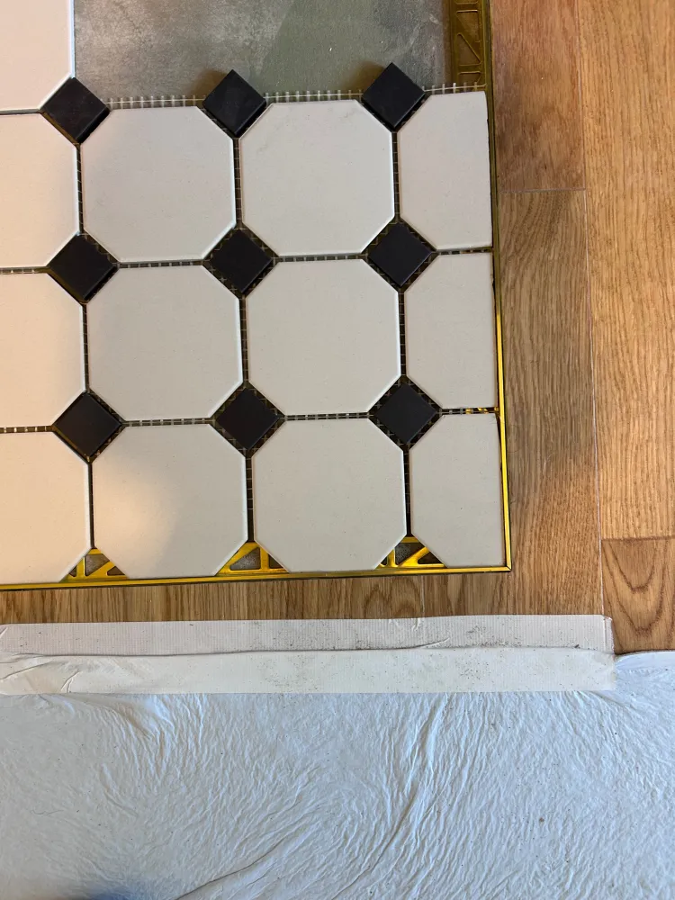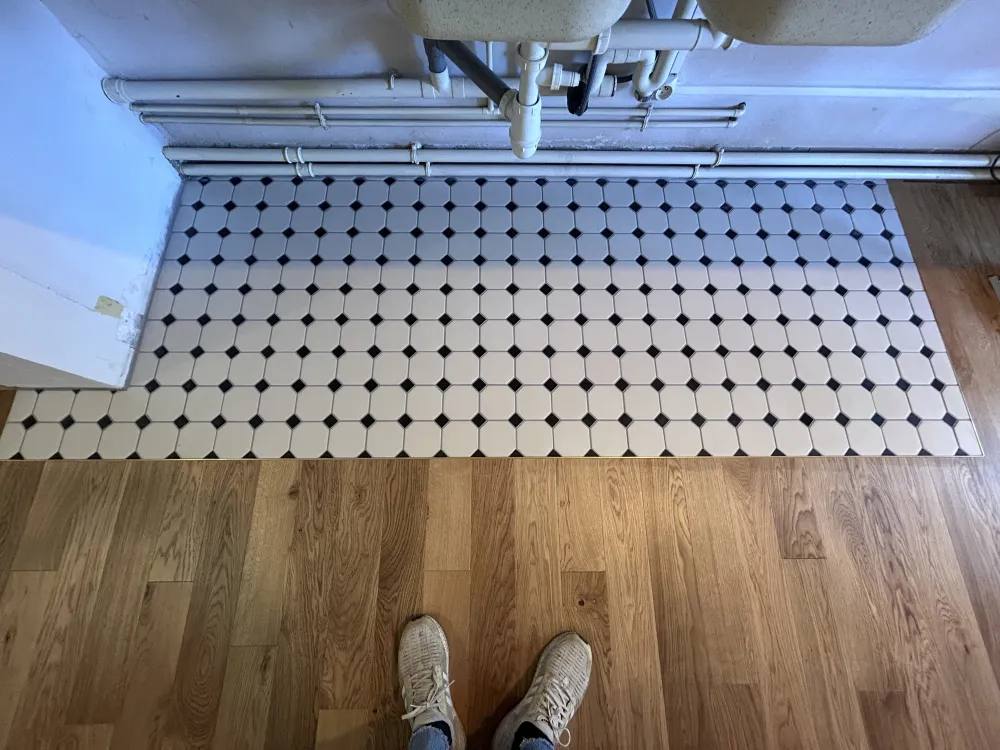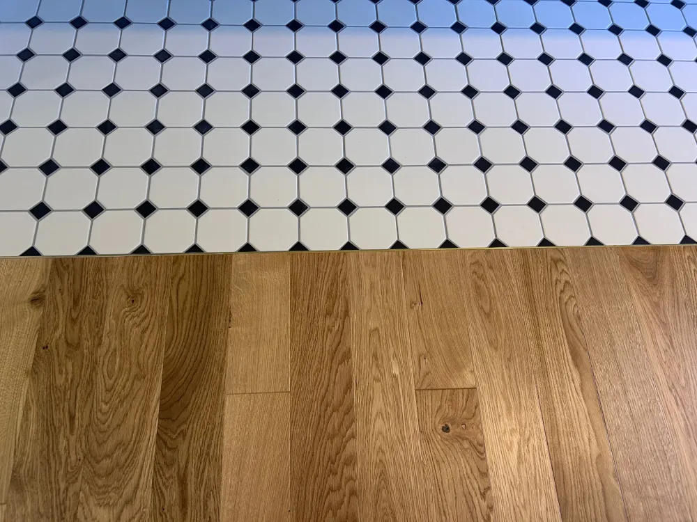 Atelier Céramique & Bois est intervenu pour la réalisation d'un tapis en carrelage jonction parquet massif chez un particulier Lyon 8.